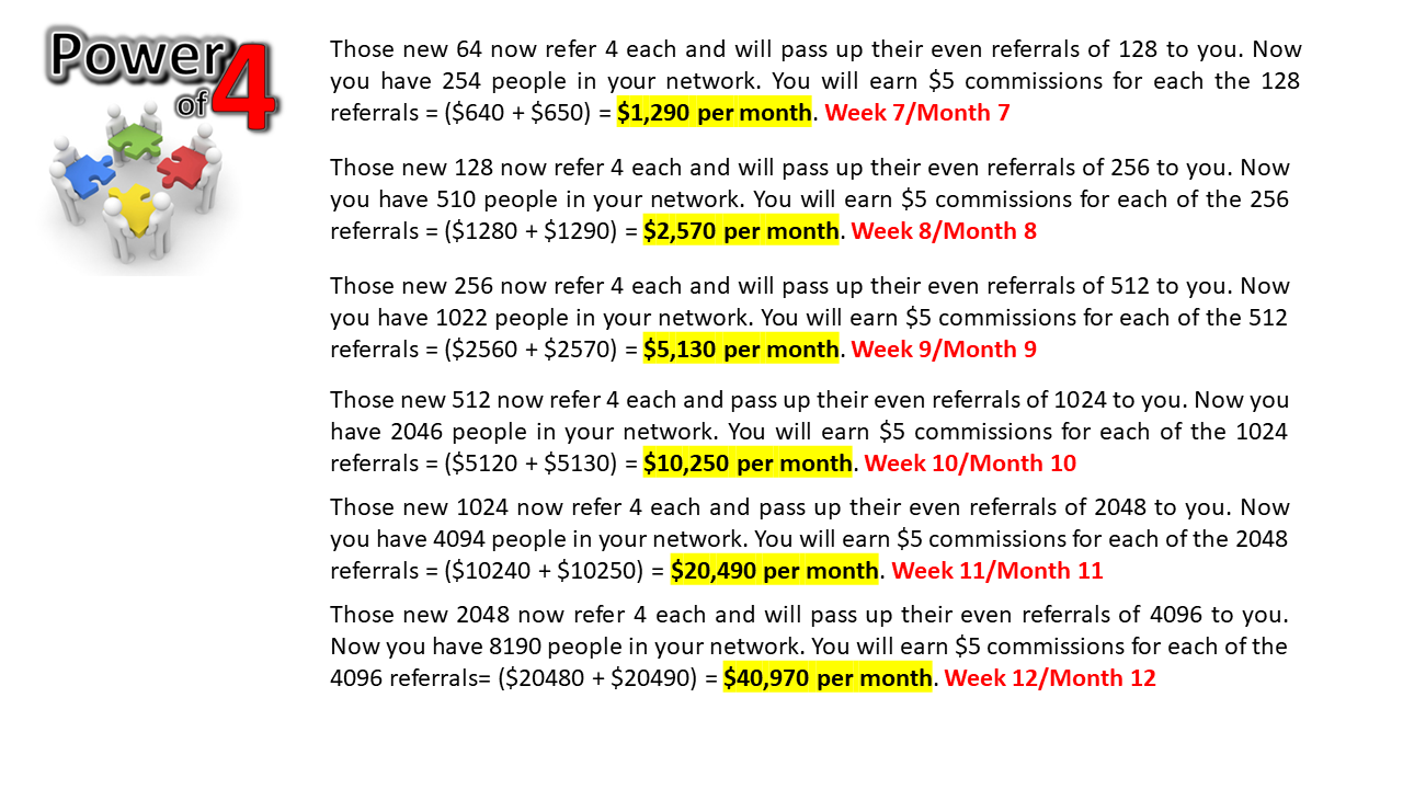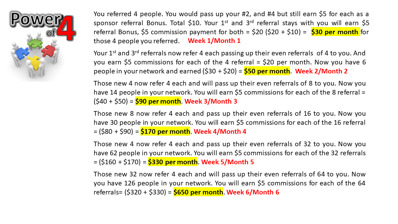 This site uses a Power Of 4 strategy method. This makes this one of the most POWERFUL compensation plans online today because you build a foundation of marketers that work for themselves but also working for you!
